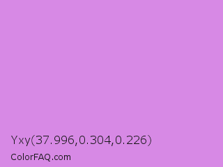 Yxy 37.996,0.304,0.226 Color is a light purple color and the nearest color is Bright Lilac #d891ef. Hex code #d789e5 and RGB value is rgb(215,137,229). In RGB color space, this color is composed of 84% red, 54% green, 90% blue, In CMYK color space, this color is composed of 6% cyan, 40% magenta, 0% yellow , 10% black , In HSL color space, this color has a hue angle of 291° , 64% saturation and 72% lightness.