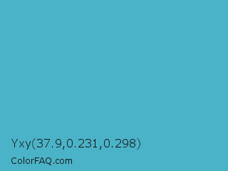 Yxy 37.9,0.231,0.298 Color is a normal cyan color and the nearest color is Maximum Blue #47abcc. Hex code #4bb3c7 and RGB value is rgb(75,179,199). In RGB color space, this color is composed of 29% red, 70% green, 78% blue, In CMYK color space, this color is composed of 62% cyan, 10% magenta, 0% yellow , 22% black , In HSL color space, this color has a hue angle of 190° , 53% saturation and 54% lightness.