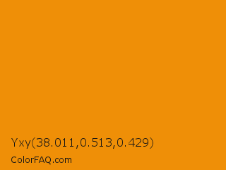 Yxy 38.011,0.513,0.429 Color is a normal orange color and the nearest color is Tangerine #f28500. Hex code #ef8f07 and RGB value is rgb(239,143,7). In RGB color space, this color is composed of 94% red, 56% green, 3% blue, In CMYK color space, this color is composed of 0% cyan, 40% magenta, 97% yellow , 6% black , In HSL color space, this color has a hue angle of 35° , 94% saturation and 48% lightness.