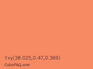 Yxy 38.025,0.47,0.369 Color is a light orange color and the nearest color is Salmon #ff8c69. Hex code #f48963 and RGB value is rgb(244,137,99). In RGB color space, this color is composed of 96% red, 54% green, 39% blue, In CMYK color space, this color is composed of 0% cyan, 44% magenta, 59% yellow , 4% black , In HSL color space, this color has a hue angle of 16° , 87% saturation and 67% lightness.