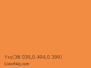 Yxy 38.039,0.494,0.399 Color is a light orange color and the nearest color is Jaffa #ef863f. Hex code #f28c43 and RGB value is rgb(242,140,67). In RGB color space, this color is composed of 95% red, 55% green, 26% blue, In CMYK color space, this color is composed of 0% cyan, 42% magenta, 72% yellow , 5% black , In HSL color space, this color has a hue angle of 25° , 87% saturation and 61% lightness.