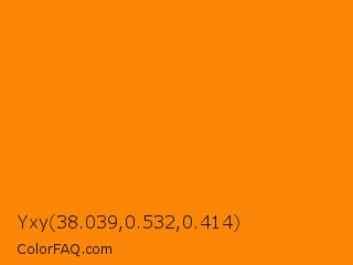 Yxy 38.039,0.532,0.414 Color is a normal orange color and the nearest color is Dark Orange #ff8c00. Hex code #fc8707 and RGB value is rgb(252,135,7). In RGB color space, this color is composed of 99% red, 53% green, 3% blue, In CMYK color space, this color is composed of 0% cyan, 46% magenta, 97% yellow , 1% black , In HSL color space, this color has a hue angle of 31° , 98% saturation and 51% lightness.