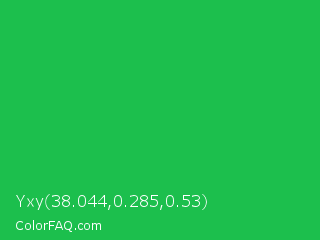 Yxy 38.044,0.285,0.53 Color is a normal green color and the nearest color is Dark Pastel Green #03c03c. Hex code #1cbf4d and RGB value is rgb(28,191,77). In RGB color space, this color is composed of 11% red, 75% green, 30% blue, In CMYK color space, this color is composed of 85% cyan, 0% magenta, 60% yellow , 25% black , In HSL color space, this color has a hue angle of 138° , 74% saturation and 43% lightness.