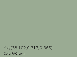 Yxy 38.102,0.317,0.365 Color is a light green color and the nearest color is Lemon Grass #9b9e8f. Hex code #9aab93 and RGB value is rgb(154,171,147). In RGB color space, this color is composed of 60% red, 67% green, 58% blue, In CMYK color space, this color is composed of 10% cyan, 0% magenta, 14% yellow , 33% black , In HSL color space, this color has a hue angle of 103° , 13% saturation and 62% lightness.