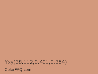 Yxy 38.112,0.401,0.364 Color is a light orange color and the nearest color is Antique Brass #cd9575. Hex code #d3997d and RGB value is rgb(211,153,125). In RGB color space, this color is composed of 83% red, 60% green, 49% blue, In CMYK color space, this color is composed of 0% cyan, 27% magenta, 41% yellow , 17% black , In HSL color space, this color has a hue angle of 20° , 49% saturation and 66% lightness.