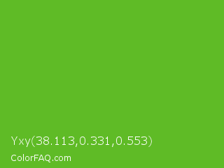 Yxy 38.113,0.331,0.553 Color is a normal green color and the nearest color is Green RYB #66b032. Hex code #5fbb26 and RGB value is rgb(95,187,38). In RGB color space, this color is composed of 37% red, 73% green, 15% blue, In CMYK color space, this color is composed of 49% cyan, 0% magenta, 80% yellow , 27% black , In HSL color space, this color has a hue angle of 97° , 66% saturation and 44% lightness.