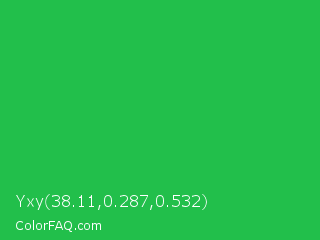 Yxy 38.11,0.287,0.532 Color is a normal green color and the nearest color is Wageningen Green #34b233. Hex code #22bf4b and RGB value is rgb(34,191,75). In RGB color space, this color is composed of 13% red, 75% green, 29% blue, In CMYK color space, this color is composed of 82% cyan, 0% magenta, 61% yellow , 25% black , In HSL color space, this color has a hue angle of 136° , 70% saturation and 44% lightness.