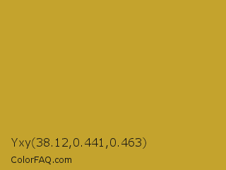 Yxy 38.12,0.441,0.463 Color is a normal yellow color and the nearest color is Hokey Pokey #c8a528. Hex code #c4a32d and RGB value is rgb(196,163,45). In RGB color space, this color is composed of 77% red, 64% green, 18% blue, In CMYK color space, this color is composed of 0% cyan, 17% magenta, 77% yellow , 23% black , In HSL color space, this color has a hue angle of 47° , 63% saturation and 47% lightness.
