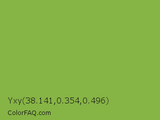 Yxy 38.141,0.354,0.496 Color is a normal green color and the nearest color is Sushi #87ab39. Hex code #86b445 and RGB value is rgb(134,180,69). In RGB color space, this color is composed of 53% red, 71% green, 27% blue, In CMYK color space, this color is composed of 26% cyan, 0% magenta, 62% yellow , 29% black , In HSL color space, this color has a hue angle of 85° , 45% saturation and 49% lightness.