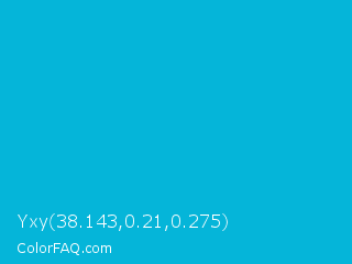 Yxy 38.143,0.21,0.275 Color is a normal cyan color and the nearest color is Cerulean #02a4d3. Hex code #05b5d9 and RGB value is rgb(5,181,217). In RGB color space, this color is composed of 2% red, 71% green, 85% blue, In CMYK color space, this color is composed of 98% cyan, 17% magenta, 0% yellow , 15% black , In HSL color space, this color has a hue angle of 190° , 95% saturation and 44% lightness.