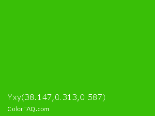 Yxy 38.147,0.313,0.587 Color is a normal green color and the nearest color is Harlequin Green #46cb18. Hex code #39bf07 and RGB value is rgb(57,191,7). In RGB color space, this color is composed of 22% red, 75% green, 3% blue, In CMYK color space, this color is composed of 70% cyan, 0% magenta, 96% yellow , 25% black , In HSL color space, this color has a hue angle of 104° , 93% saturation and 39% lightness.