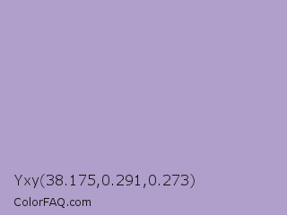 Yxy 38.175,0.291,0.273 Color is a light violet color and the nearest color is Logan #aaa9cd. Hex code #af9fca and RGB value is rgb(175,159,202). In RGB color space, this color is composed of 69% red, 62% green, 79% blue, In CMYK color space, this color is composed of 13% cyan, 21% magenta, 0% yellow , 21% black , In HSL color space, this color has a hue angle of 262° , 29% saturation and 71% lightness.
