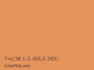 Yxy 38.1,0.456,0.393 Color is a light orange color and the nearest color is Big Foot Feet #e88e5a. Hex code #e4935a and RGB value is rgb(228,147,90). In RGB color space, this color is composed of 89% red, 58% green, 35% blue, In CMYK color space, this color is composed of 0% cyan, 36% magenta, 61% yellow , 11% black , In HSL color space, this color has a hue angle of 25° , 72% saturation and 62% lightness.