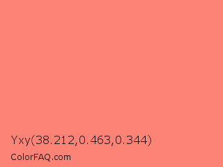 Yxy 38.212,0.463,0.344 Color is a light red color and the nearest color is Salmon #fa8072. Hex code #fc8375 and RGB value is rgb(252,131,117). In RGB color space, this color is composed of 99% red, 51% green, 46% blue, In CMYK color space, this color is composed of 0% cyan, 48% magenta, 54% yellow , 1% black , In HSL color space, this color has a hue angle of 6° , 96% saturation and 72% lightness.