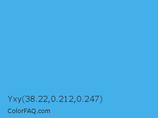 Yxy 38.22,0.212,0.247 Color is a normal blue color and the nearest color is Picton Blue #45b1e8. Hex code #44b0ea and RGB value is rgb(68,176,234). In RGB color space, this color is composed of 27% red, 69% green, 92% blue, In CMYK color space, this color is composed of 71% cyan, 25% magenta, 0% yellow , 8% black , In HSL color space, this color has a hue angle of 201° , 80% saturation and 59% lightness.
