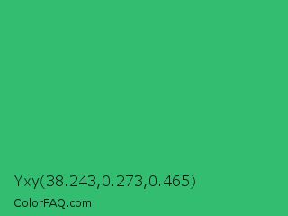 Yxy 38.243,0.273,0.465 Color is a normal green color and the nearest color is Medium Sea Green #3cb371. Hex code #32bd70 and RGB value is rgb(50,189,112). In RGB color space, this color is composed of 20% red, 74% green, 44% blue, In CMYK color space, this color is composed of 74% cyan, 0% magenta, 41% yellow , 26% black , In HSL color space, this color has a hue angle of 147° , 58% saturation and 47% lightness.