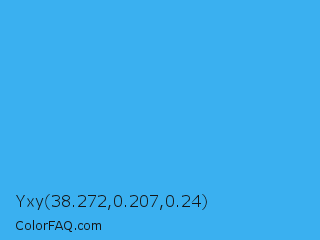 Yxy 38.272,0.207,0.24 Color is a normal blue color and the nearest color is Picton Blue #45b1e8. Hex code #3ab0f0 and RGB value is rgb(58,176,240). In RGB color space, this color is composed of 23% red, 69% green, 94% blue, In CMYK color space, this color is composed of 76% cyan, 27% magenta, 0% yellow , 6% black , In HSL color space, this color has a hue angle of 201° , 86% saturation and 58% lightness.