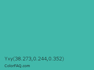 Yxy 38.273,0.244,0.352 Color is a normal cyan color and the nearest color is Verdigris #43b3ae. Hex code #41b8aa and RGB value is rgb(65,184,170). In RGB color space, this color is composed of 25% red, 72% green, 67% blue, In CMYK color space, this color is composed of 65% cyan, 0% magenta, 8% yellow , 28% black , In HSL color space, this color has a hue angle of 173° , 48% saturation and 49% lightness.