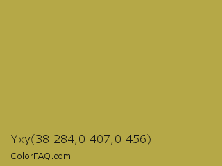 Yxy 38.284,0.407,0.456 Color is a normal yellow color and the nearest color is Brass #b5a642. Hex code #b5a847 and RGB value is rgb(181,168,71). In RGB color space, this color is composed of 71% red, 66% green, 28% blue, In CMYK color space, this color is composed of 0% cyan, 7% magenta, 61% yellow , 29% black , In HSL color space, this color has a hue angle of 53° , 44% saturation and 49% lightness.
