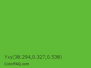 Yxy 38.294,0.327,0.538 Color is a normal green color and the nearest color is Green RYB #66b032. Hex code #60bb36 and RGB value is rgb(96,187,54). In RGB color space, this color is composed of 38% red, 73% green, 21% blue, In CMYK color space, this color is composed of 49% cyan, 0% magenta, 71% yellow , 27% black , In HSL color space, this color has a hue angle of 101° , 55% saturation and 47% lightness.