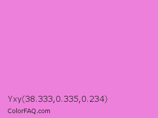 Yxy 38.333,0.335,0.234 Color is a light magenta color and the nearest color is Pale Magenta #f984e5. Hex code #ec80da and RGB value is rgb(236,128,218). In RGB color space, this color is composed of 93% red, 50% green, 85% blue, In CMYK color space, this color is composed of 0% cyan, 46% magenta, 8% yellow , 7% black , In HSL color space, this color has a hue angle of 310° , 74% saturation and 71% lightness.