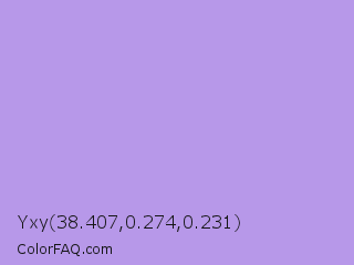 Yxy 38.407,0.274,0.231 Color is a light violet color and the nearest color is Bright Lavender #bf94e4. Hex code #b798e9 and RGB value is rgb(183,152,233). In RGB color space, this color is composed of 72% red, 60% green, 91% blue, In CMYK color space, this color is composed of 21% cyan, 35% magenta, 0% yellow , 9% black , In HSL color space, this color has a hue angle of 263° , 65% saturation and 75% lightness.