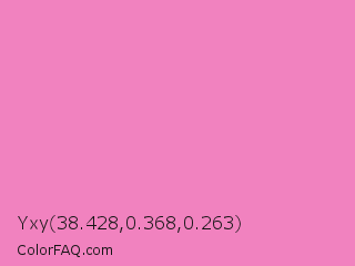 Yxy 38.428,0.368,0.263 Color is a light magenta color and the nearest color is Persian Pink #f77fbe. Hex code #f182bf and RGB value is rgb(241,130,191). In RGB color space, this color is composed of 95% red, 51% green, 75% blue, In CMYK color space, this color is composed of 0% cyan, 46% magenta, 21% yellow , 5% black , In HSL color space, this color has a hue angle of 327° , 80% saturation and 73% lightness.