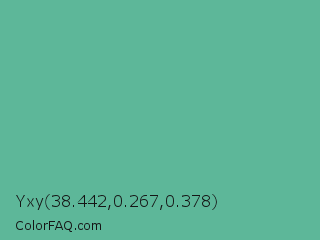 Yxy 38.442,0.267,0.378 Color is a normal green color and the nearest color is Silver Tree #66b58f. Hex code #5db799 and RGB value is rgb(93,183,153). In RGB color space, this color is composed of 36% red, 72% green, 60% blue, In CMYK color space, this color is composed of 49% cyan, 0% magenta, 16% yellow , 28% black , In HSL color space, this color has a hue angle of 160° , 38% saturation and 54% lightness.