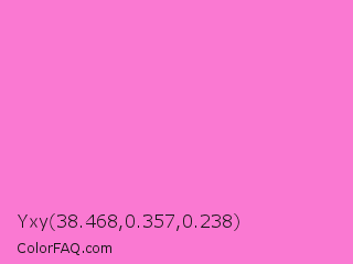 Yxy 38.468,0.357,0.238 Color is a light magenta color and the nearest color is Princess Perfume #ff85cf. Hex code #fa79d2 and RGB value is rgb(250,121,210). In RGB color space, this color is composed of 98% red, 47% green, 82% blue, In CMYK color space, this color is composed of 0% cyan, 52% magenta, 16% yellow , 2% black , In HSL color space, this color has a hue angle of 319° , 93% saturation and 73% lightness.