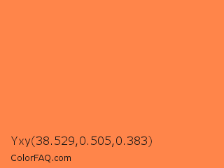 Yxy 38.529,0.505,0.383 Color is a light orange color and the nearest color is Mango Tango #ff8243. Hex code #ff854a and RGB value is rgb(255,133,74). In RGB color space, this color is composed of 100% red, 52% green, 29% blue, In CMYK color space, this color is composed of 0% cyan, 48% magenta, 71% yellow , 0% black , In HSL color space, this color has a hue angle of 20° , 100% saturation and 65% lightness.