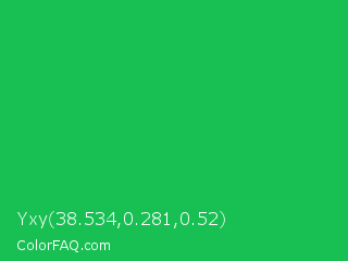 Yxy 38.534,0.281,0.52 Color is a normal green color and the nearest color is Malachite #0bda51. Hex code #18c054 and RGB value is rgb(24,192,84). In RGB color space, this color is composed of 9% red, 75% green, 33% blue, In CMYK color space, this color is composed of 88% cyan, 0% magenta, 56% yellow , 25% black , In HSL color space, this color has a hue angle of 141° , 78% saturation and 42% lightness.