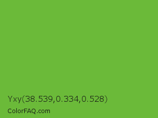 Yxy 38.539,0.334,0.528 Color is a normal green color and the nearest color is Green RYB #66b032. Hex code #6bba39 and RGB value is rgb(107,186,57). In RGB color space, this color is composed of 42% red, 73% green, 22% blue, In CMYK color space, this color is composed of 42% cyan, 0% magenta, 69% yellow , 27% black , In HSL color space, this color has a hue angle of 97° , 53% saturation and 48% lightness.