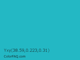 Yxy 38.59,0.223,0.31 Color is a normal cyan color and the nearest color is Java #1fc2c2. Hex code #23b8c4 and RGB value is rgb(35,184,196). In RGB color space, this color is composed of 14% red, 72% green, 77% blue, In CMYK color space, this color is composed of 82% cyan, 6% magenta, 0% yellow , 23% black , In HSL color space, this color has a hue angle of 184° , 70% saturation and 45% lightness.