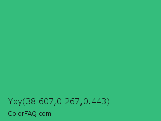 Yxy 38.607,0.267,0.443 Color is a normal green color and the nearest color is Medium Sea Green #3cb371. Hex code #34bd7c and RGB value is rgb(52,189,124). In RGB color space, this color is composed of 20% red, 74% green, 49% blue, In CMYK color space, this color is composed of 72% cyan, 0% magenta, 34% yellow , 26% black , In HSL color space, this color has a hue angle of 152° , 57% saturation and 47% lightness.