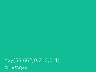 Yxy 38.662,0.246,0.4 Color is a normal cyan color and the nearest color is Mountain Meadow Crayola #1ab385. Hex code #11bd94 and RGB value is rgb(17,189,148). In RGB color space, this color is composed of 7% red, 74% green, 58% blue, In CMYK color space, this color is composed of 91% cyan, 0% magenta, 22% yellow , 26% black , In HSL color space, this color has a hue angle of 166° , 83% saturation and 40% lightness.