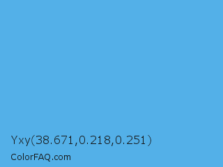 Yxy 38.671,0.218,0.251 Color is a light blue color and the nearest color is Blue Jeans #5dadec. Hex code #53b0e8 and RGB value is rgb(83,176,232). In RGB color space, this color is composed of 33% red, 69% green, 91% blue, In CMYK color space, this color is composed of 64% cyan, 24% magenta, 0% yellow , 9% black , In HSL color space, this color has a hue angle of 203° , 76% saturation and 62% lightness.