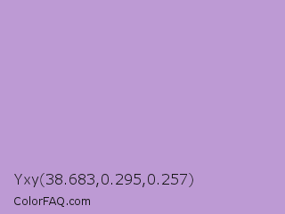 Yxy 38.683,0.295,0.257 Color is a light purple color and the nearest color is Light Pastel Purple #b19cd9. Hex code #bd9ad4 and RGB value is rgb(189,154,212). In RGB color space, this color is composed of 74% red, 60% green, 83% blue, In CMYK color space, this color is composed of 11% cyan, 27% magenta, 0% yellow , 17% black , In HSL color space, this color has a hue angle of 276° , 40% saturation and 72% lightness.