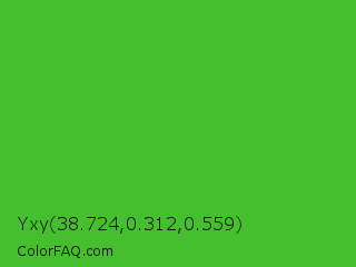 Yxy 38.724,0.312,0.559 Color is a normal green color and the nearest color is Wageningen Green #34b233. Hex code #46bf2e and RGB value is rgb(70,191,46). In RGB color space, this color is composed of 27% red, 75% green, 18% blue, In CMYK color space, this color is composed of 63% cyan, 0% magenta, 76% yellow , 25% black , In HSL color space, this color has a hue angle of 110° , 61% saturation and 46% lightness.