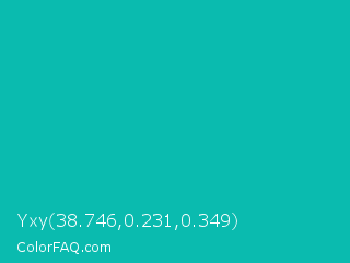 Yxy 38.746,0.231,0.349 Color is a normal cyan color and the nearest color is Tiffany Blue #0abab5. Hex code #0abbaf and RGB value is rgb(10,187,175). In RGB color space, this color is composed of 4% red, 73% green, 69% blue, In CMYK color space, this color is composed of 95% cyan, 0% magenta, 6% yellow , 27% black , In HSL color space, this color has a hue angle of 176° , 90% saturation and 39% lightness.