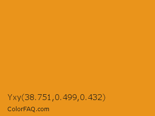 Yxy 38.751,0.499,0.432 Color is a normal orange color and the nearest color is Carrot Orange #ed9121. Hex code #ea941b and RGB value is rgb(234,148,27). In RGB color space, this color is composed of 92% red, 58% green, 11% blue, In CMYK color space, this color is composed of 0% cyan, 37% magenta, 88% yellow , 8% black , In HSL color space, this color has a hue angle of 35° , 83% saturation and 51% lightness.