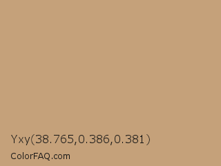 Yxy 38.765,0.386,0.381 Color is a light orange color and the nearest color is Light French Beige #c8ad7f. Hex code #c5a17a and RGB value is rgb(197,161,122). In RGB color space, this color is composed of 77% red, 63% green, 48% blue, In CMYK color space, this color is composed of 0% cyan, 18% magenta, 38% yellow , 23% black , In HSL color space, this color has a hue angle of 31° , 39% saturation and 63% lightness.