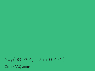 Yxy 38.794,0.266,0.435 Color is a normal green color and the nearest color is Mint #3eb489. Hex code #38bd80 and RGB value is rgb(56,189,128). In RGB color space, this color is composed of 22% red, 74% green, 50% blue, In CMYK color space, this color is composed of 70% cyan, 0% magenta, 32% yellow , 26% black , In HSL color space, this color has a hue angle of 152° , 54% saturation and 48% lightness.
