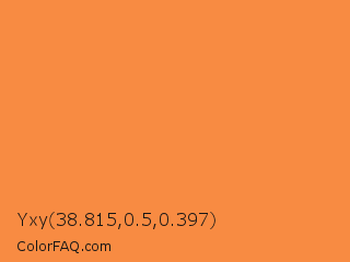 Yxy 38.815,0.5,0.397 Color is a light orange color and the nearest color is Jaffa #ef863f. Hex code #f88b42 and RGB value is rgb(248,139,66). In RGB color space, this color is composed of 97% red, 55% green, 26% blue, In CMYK color space, this color is composed of 0% cyan, 44% magenta, 73% yellow , 3% black , In HSL color space, this color has a hue angle of 24° , 93% saturation and 62% lightness.