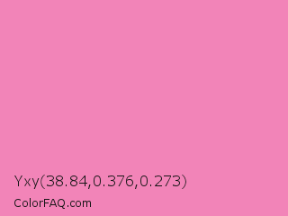 Yxy 38.84,0.376,0.273 Color is a light rose color and the nearest color is Persian Pink #f77fbe. Hex code #f284b8 and RGB value is rgb(242,132,184). In RGB color space, this color is composed of 95% red, 52% green, 72% blue, In CMYK color space, this color is composed of 0% cyan, 45% magenta, 24% yellow , 5% black , In HSL color space, this color has a hue angle of 332° , 81% saturation and 73% lightness.