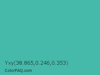 Yxy 38.865,0.246,0.353 Color is a normal cyan color and the nearest color is Verdigris #43b3ae. Hex code #45b9aa and RGB value is rgb(69,185,170). In RGB color space, this color is composed of 27% red, 73% green, 67% blue, In CMYK color space, this color is composed of 63% cyan, 0% magenta, 8% yellow , 27% black , In HSL color space, this color has a hue angle of 172° , 46% saturation and 50% lightness.