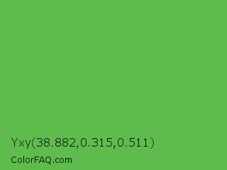 Yxy 38.882,0.315,0.511 Color is a normal green color and the nearest color is Apple #4fa83d. Hex code #5ebc4d and RGB value is rgb(94,188,77). In RGB color space, this color is composed of 37% red, 74% green, 30% blue, In CMYK color space, this color is composed of 50% cyan, 0% magenta, 59% yellow , 26% black , In HSL color space, this color has a hue angle of 111° , 45% saturation and 52% lightness.