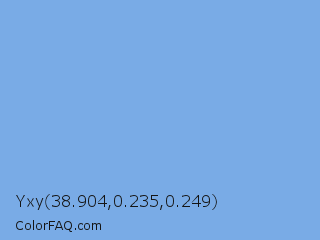Yxy 38.904,0.235,0.249 Color is a light blue color and the nearest color is Aero #7cb9e8. Hex code #79abe6 and RGB value is rgb(121,171,230). In RGB color space, this color is composed of 47% red, 67% green, 90% blue, In CMYK color space, this color is composed of 47% cyan, 26% magenta, 0% yellow , 10% black , In HSL color space, this color has a hue angle of 212° , 69% saturation and 69% lightness.