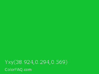 Yxy 38.924,0.294,0.569 Color is a normal green color and the nearest color is Dark Pastel Green #03c03c. Hex code #13c231 and RGB value is rgb(19,194,49). In RGB color space, this color is composed of 7% red, 76% green, 19% blue, In CMYK color space, this color is composed of 90% cyan, 0% magenta, 75% yellow , 24% black , In HSL color space, this color has a hue angle of 130° , 82% saturation and 42% lightness.