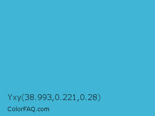 Yxy 38.993,0.221,0.28 Color is a normal cyan color and the nearest color is Maximum Blue #47abcc. Hex code #40b5d6 and RGB value is rgb(64,181,214). In RGB color space, this color is composed of 25% red, 71% green, 84% blue, In CMYK color space, this color is composed of 70% cyan, 15% magenta, 0% yellow , 16% black , In HSL color space, this color has a hue angle of 193° , 65% saturation and 55% lightness.
