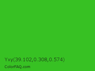 Yxy 39.102,0.308,0.574 Color is a normal green color and the nearest color is Lime Green #32cd32. Hex code #37c123 and RGB value is rgb(55,193,35). In RGB color space, this color is composed of 22% red, 76% green, 14% blue, In CMYK color space, this color is composed of 72% cyan, 0% magenta, 82% yellow , 24% black , In HSL color space, this color has a hue angle of 112° , 69% saturation and 45% lightness.